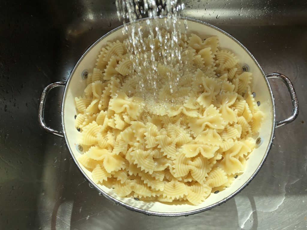 In the meantime, cook the pasta in plenty of salted boiling water. Drain it al dente and stop its cooking by rinsing it under cold running water.