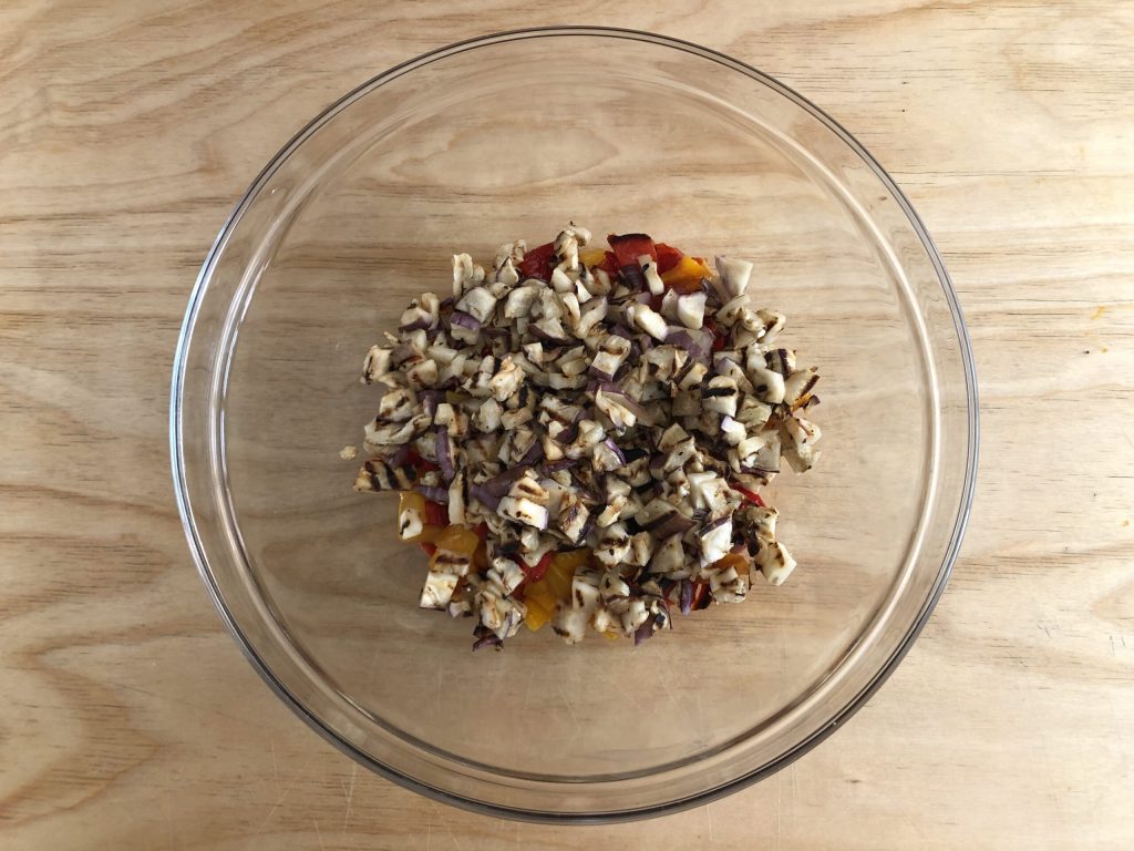 Peel the onion, slice it into rings, and grill them as well. Then add the onion rings to the other vegetables.