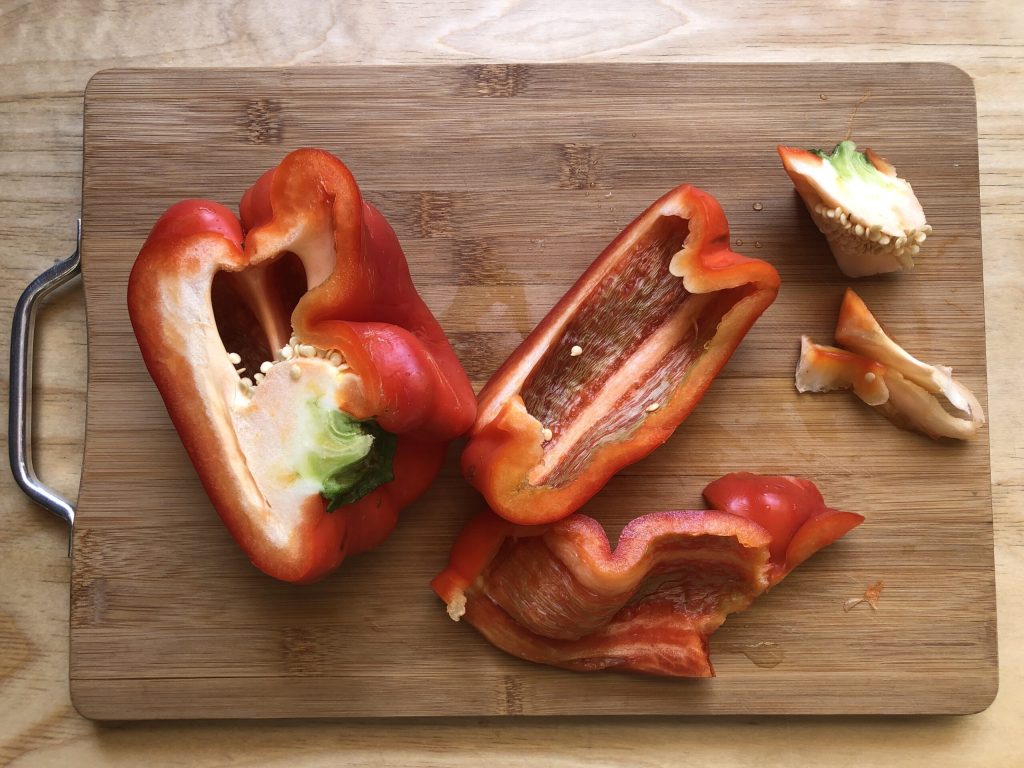 • Remove the stem end from the peppers, cut them in half, and eliminate all the seeds and internal white filaments.