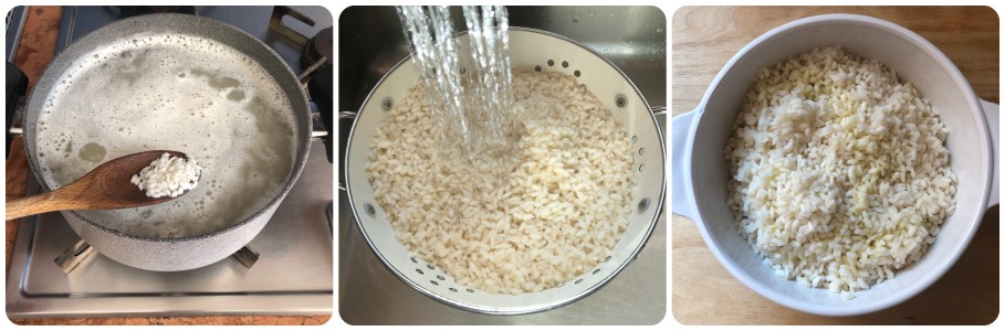 • Boil the rice in plenty of salted water, drain it al dente, and immediately rinse it under cold running water to stop the cooking. Then transfer it to a bowl, season with a drizzle of oil, and place it in the refrigerator while you proceed with the rest of the preparation.