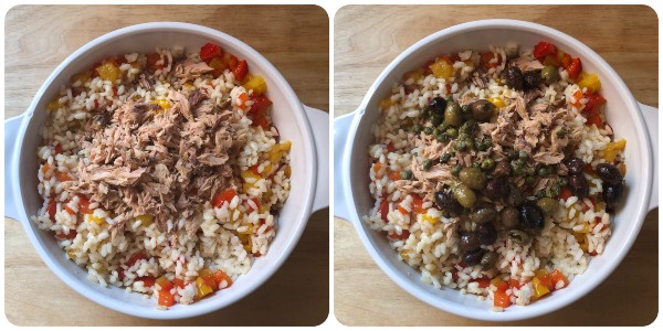 • Drain the mackerel fillets from their preservation oil, crumble them, and add them to the rice along with the capers and black olives. If you prefer, you can use tuna.