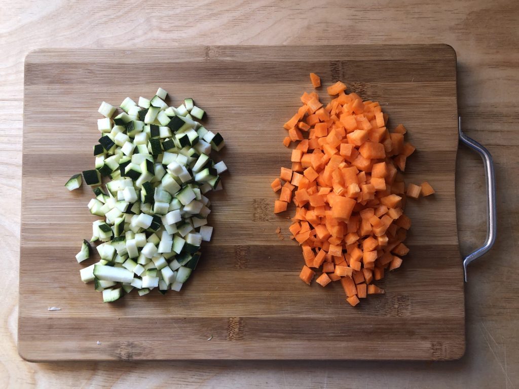 Trim the zucchini and scrape the carrots. Then wash them, pat them dry with kitchen paper, and cut them into cubes. To do this easily, first cut them into matchsticks: I show you HERE how to proceed.