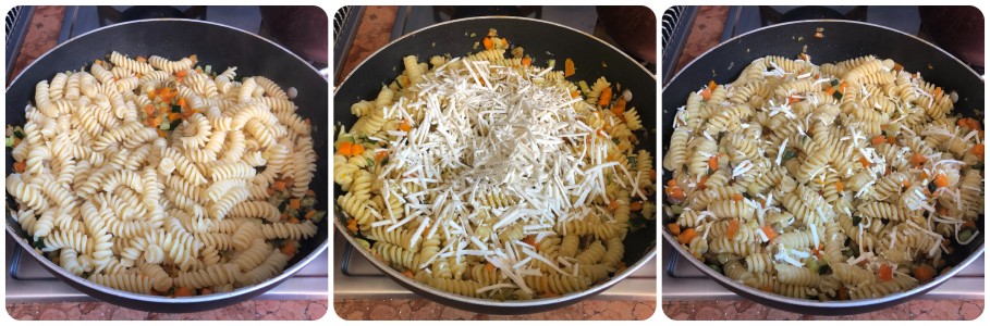 Cook for 5 minutes over medium heat, stirring occasionally. Then add the green olives, a couple of generous pinches of salt, and a generous grind of black pepper and continue cooking for another 4/5 minutes. The cooking time, admittedly, depends a lot on the size of your vegetables. So adjust by eye. Once cooked, the zucchini and carrots should be tender but still crunchy. They should not turn to mush.