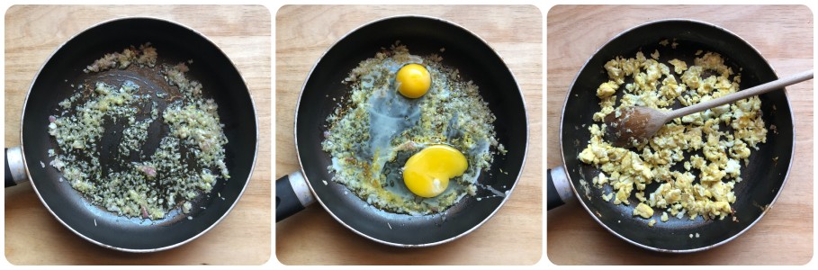 • Let it sizzle for a moment, then add the eggs, lightly salt them, scramble them with a wooden spoon and cook until they are well set. Set aside.