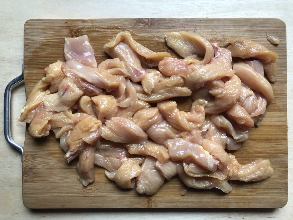 In a large pan, melt the butter in a few tablespoons of oil, then add the chicken strips and quickly brown them.