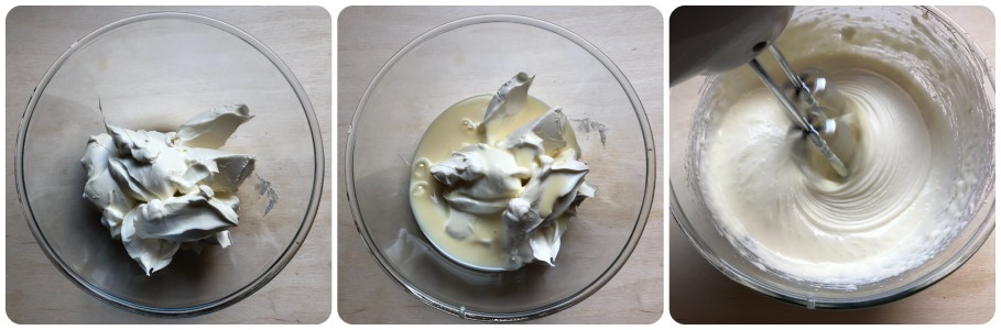 In a large bowl, place the cream cheese, add the condensed milk and mix well with the electric whisk.