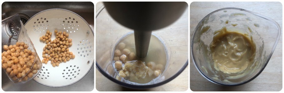 Take slightly more than half, transfer them into an immersion blender’s cup, add a ladle of pasta cooking water, and blend until you get a smooth and homogeneous cream. Leave the other chickpeas whole.