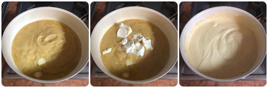 Let it sizzle for a moment, before adding the chickpea cream and robiola cheese. Stir until the cheese has completely melted.