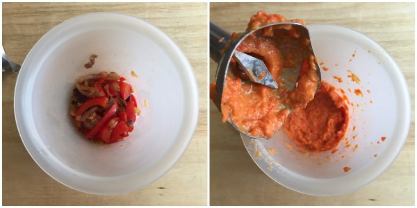 Then transfer everything to the cup of an immersion blender and blend until you get a smooth cream (if you wish, you can set aside some pepper strips to use for the final decoration of the dishes).