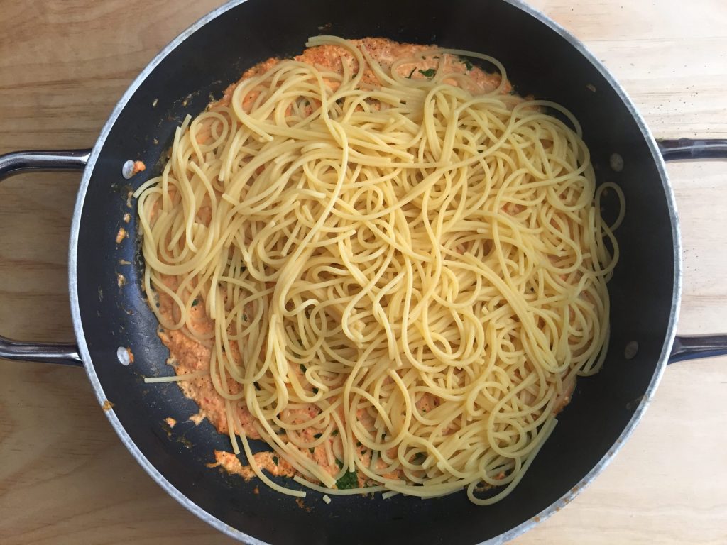 Meanwhile, cook the spaghetti in plenty of boiling salted water; drain them al dente, but not too dry, keeping some cooking water aside. Transfer them directly into the sauce pan and mix all ingredients well. Use the reserved water to soften the sauce if necessary.