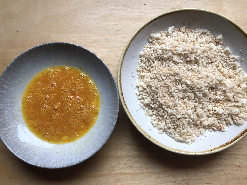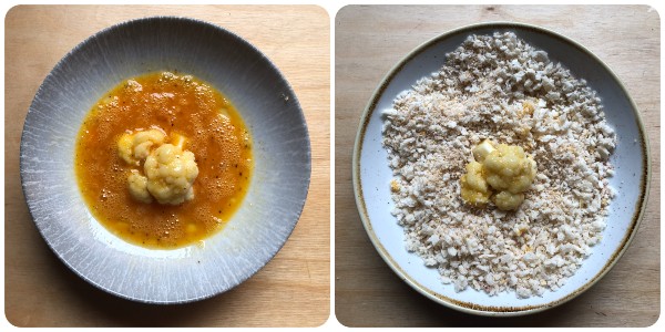 At this point, dip each floret first in the egg and then in the dry coating, pressing lightly into the mix so it sticks well.