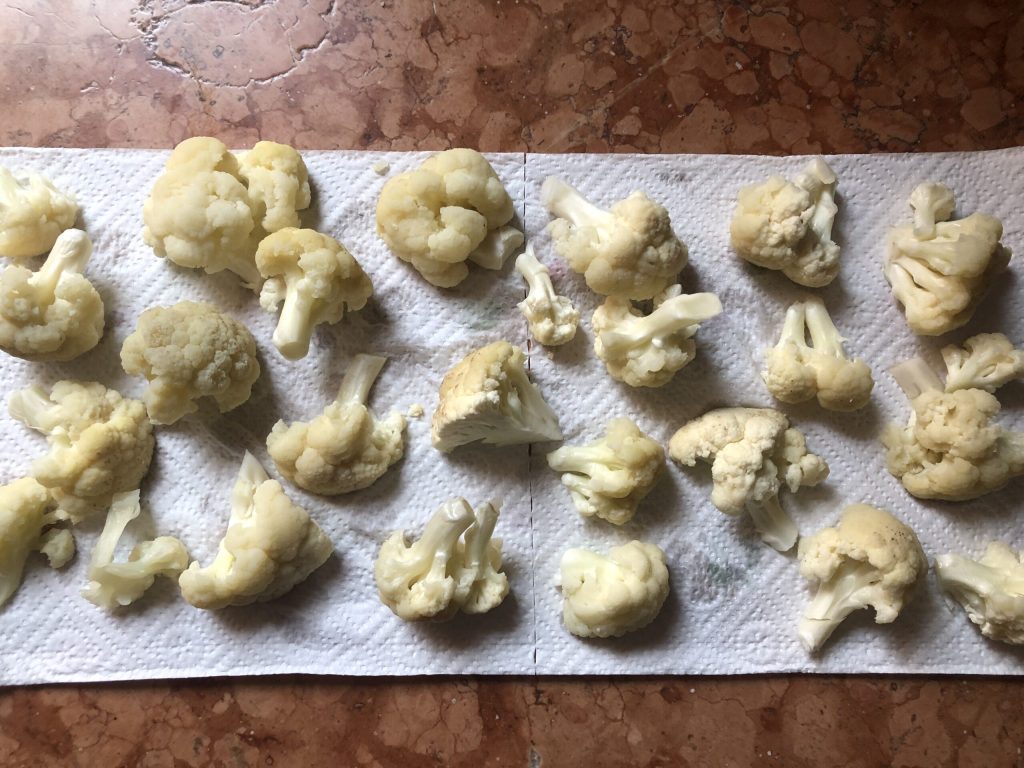 Separate the cauliflower into florets, wash them and steam them for 10 minutes. They should be tender but still firm. If they become too soft, they won’t be crispy later. To check for perfect doneness, pierce with a fork: it should enter without the florets falling apart.