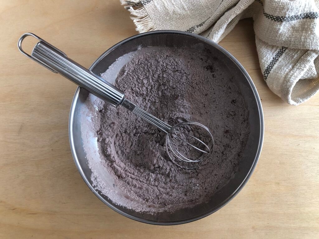 Mix the flour with the unsweetened cocoa powder, baking soda, and salt.