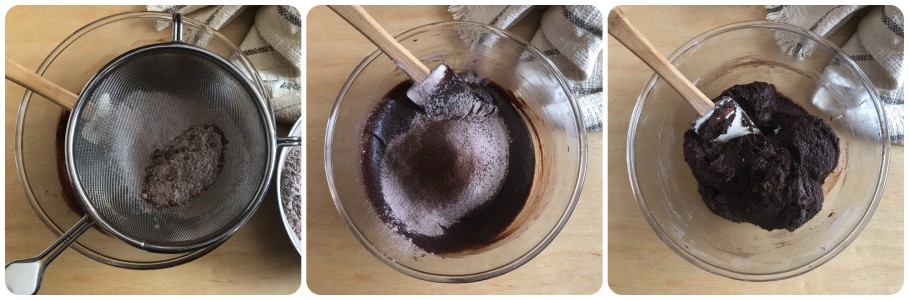 Then gradually add this mixture by sifting it through a fine-mesh sieve. Mix everything with a spatula until the dry ingredients are perfectly incorporated into the dough. You will obtain a fairly soft but easily workable mixture.