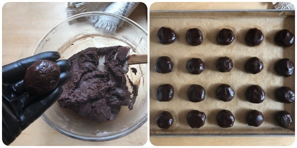 Finally, shape the dough into balls weighing about 1 oz, place them on a baking tray lined with parchment paper, and flatten them slightly on top. Keep them spaced apart because they will spread during baking.
