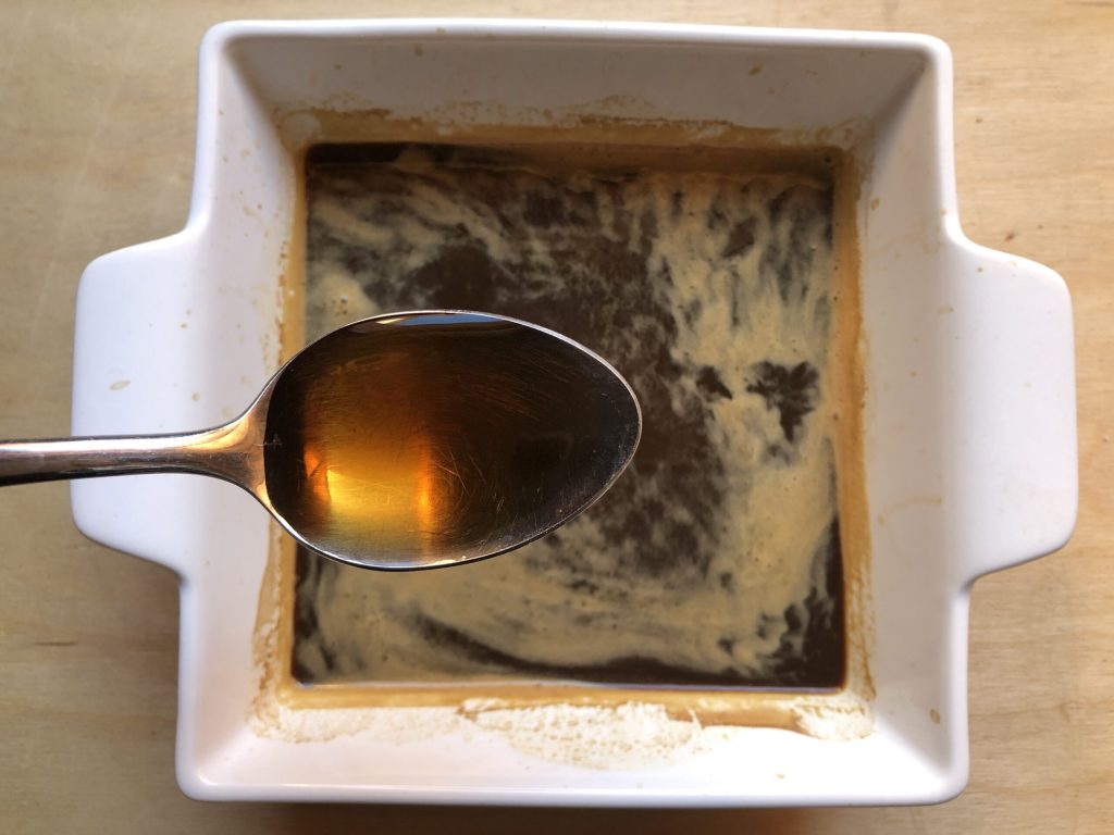 At this point, divide the mixture into two equal parts. In the photo, they do not seem equal, but they are because I weighed them: they are about 7.5 oz each.
