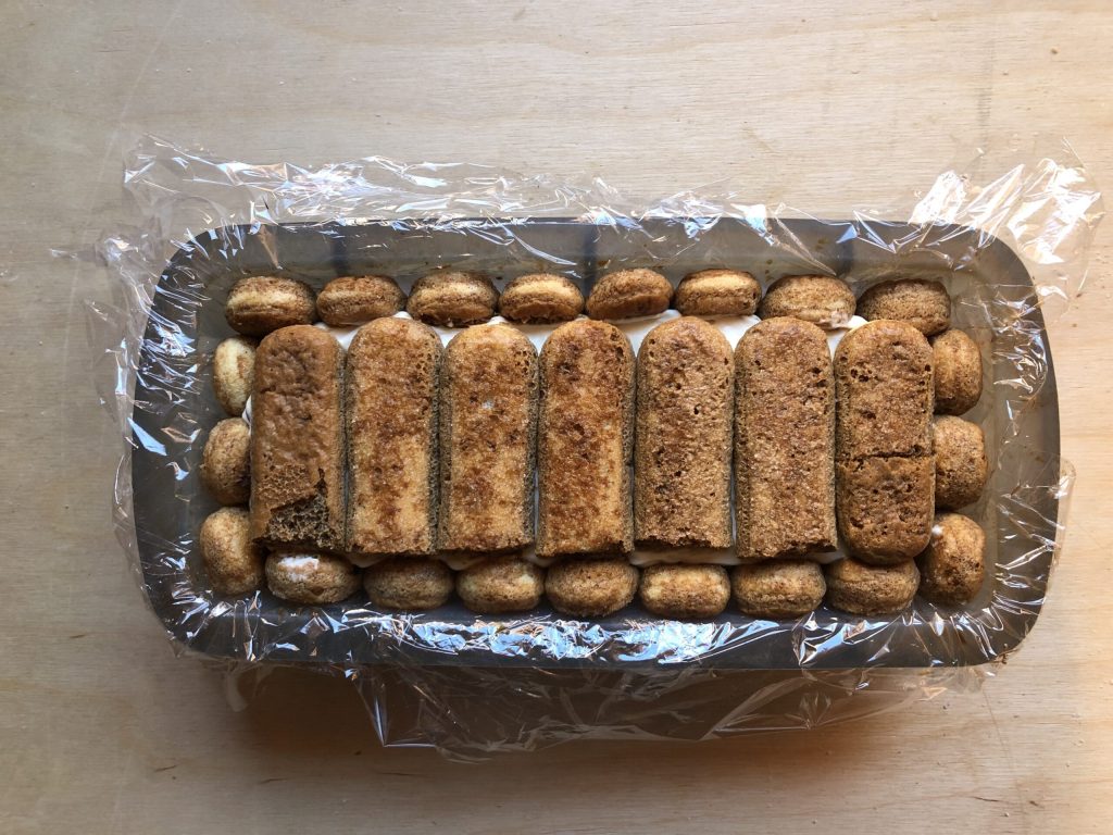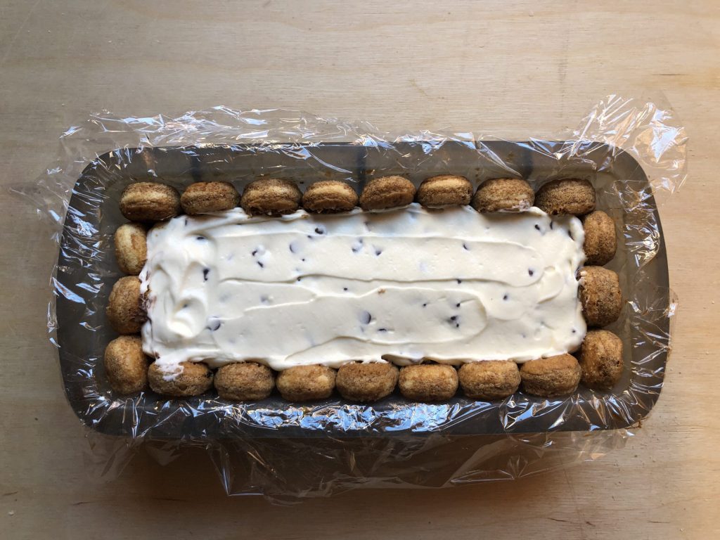 Line the bottom and sides of the mold with ladyfingers cut to size and quickly dipped in the coffee mixture.