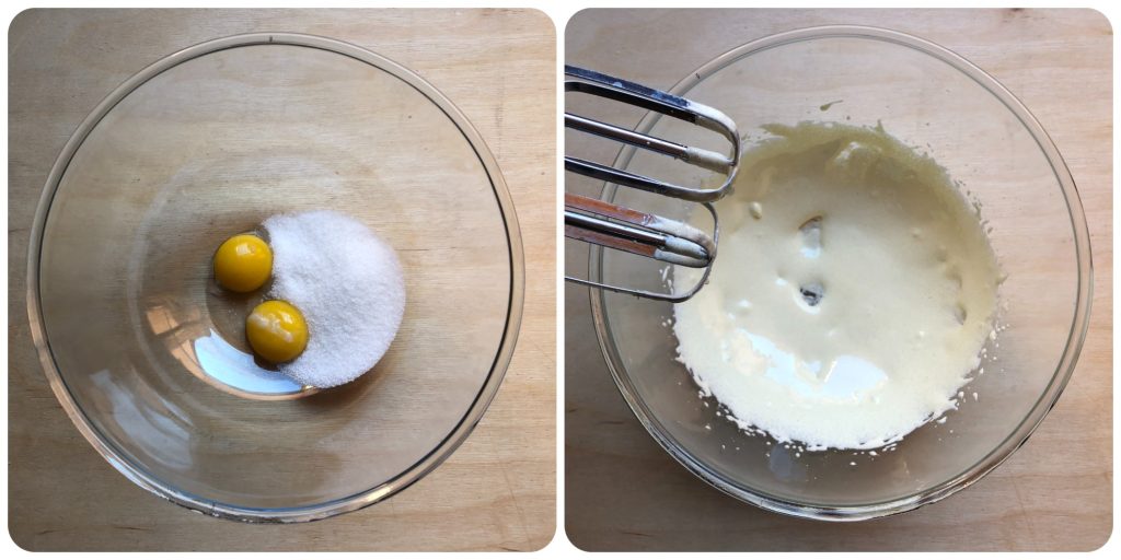 Place the two yolks in a second bowl, add the remaining 1.5 oz of sugar, and beat with electric beaters until you obtain a light mixture.