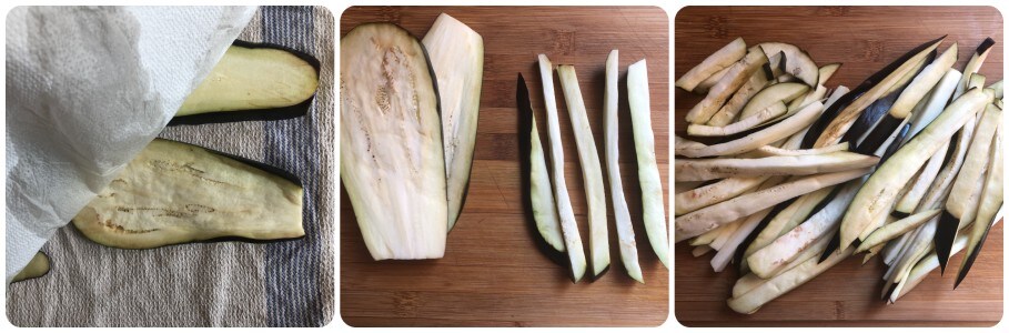 After the resting time for the eggplants, remove the remaining salt by quickly rinsing the slices and patting them dry with a cloth or paper towel. Then cut them into strips lengthwise.