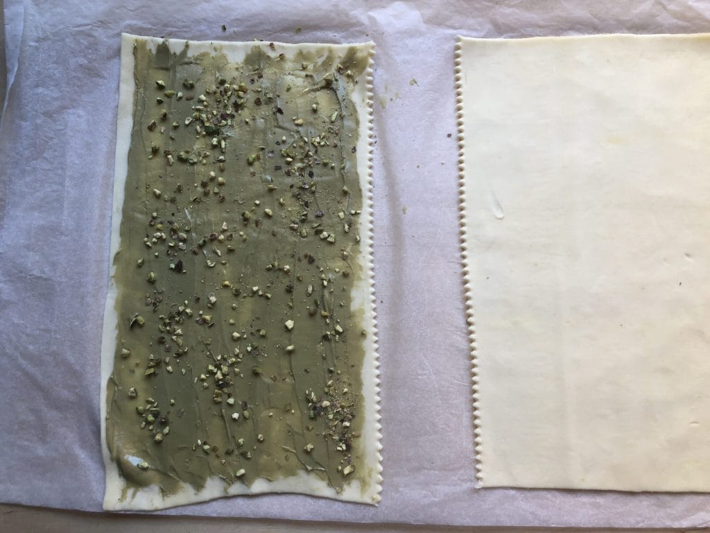 • Spread the pistachio cream evenly over one half, then sprinkle the pistachio crumbs.