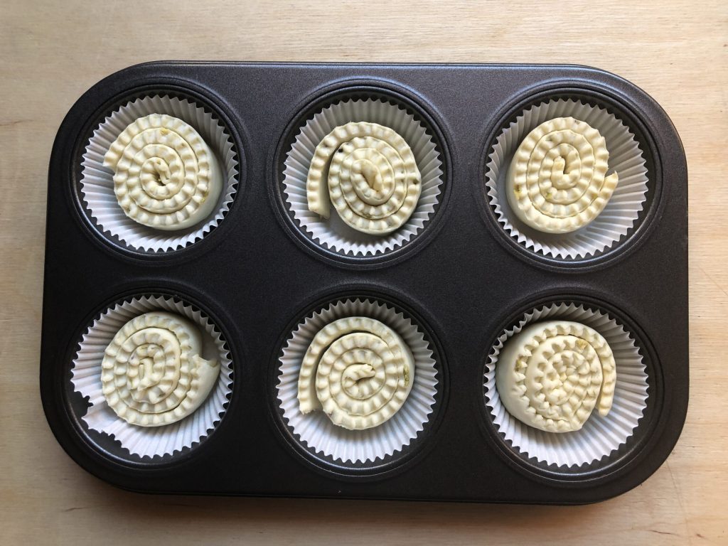 • Insert the paper cups into the cavities of one (or two) muffin molds; roll each strip on itself and place the obtained rolls inside the paper cups.