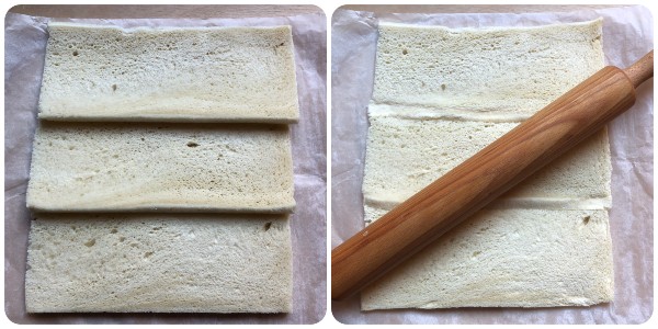 • Place on a sheet of baking paper, three slices of sandwich bread, slightly overlapping them. Then roll over with the rolling pin to seal them. By compacting slightly, the bread will become more elastic and easier to roll