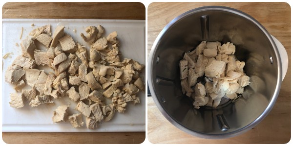 Drain the chicken breast, cut it into pieces, and place them in a mixer.