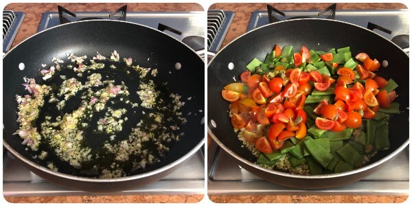 In a large pan, heat a few tablespoons of oil before adding the shallot. Let it sizzle for a moment, then add the flat beans, cherry tomatoes, and capers.