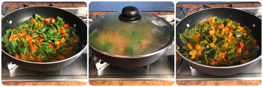 A very simple but really tasty and tempting recipe for flat beans and cherry tomatoes. An easy side dish to prepare, perfect for scooping up with bread. Indeed, during cooking, a very tasty sauce forms, which, I assure you, won’t be left over. A quick little recipe that is very much appreciated.