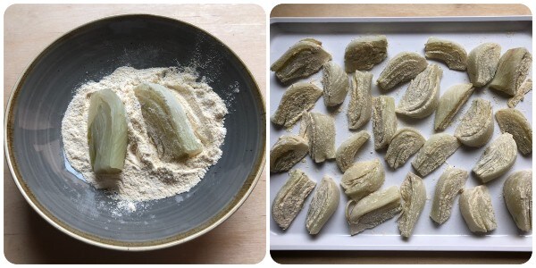 Meanwhile, clean the fennel by removing the stalks and only part of the base. Wash them and cut them into wedges. If you keep part of the base, it’s easier for the wedges to stay whole during cooking.
