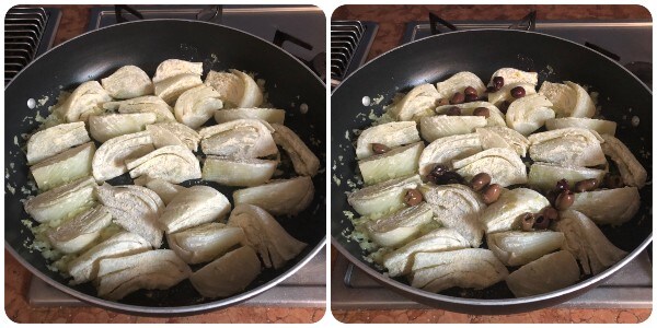 When the butter has melted, place the breaded fennel and Taggiasca olives in the pan and season with a generous pinch of salt.
