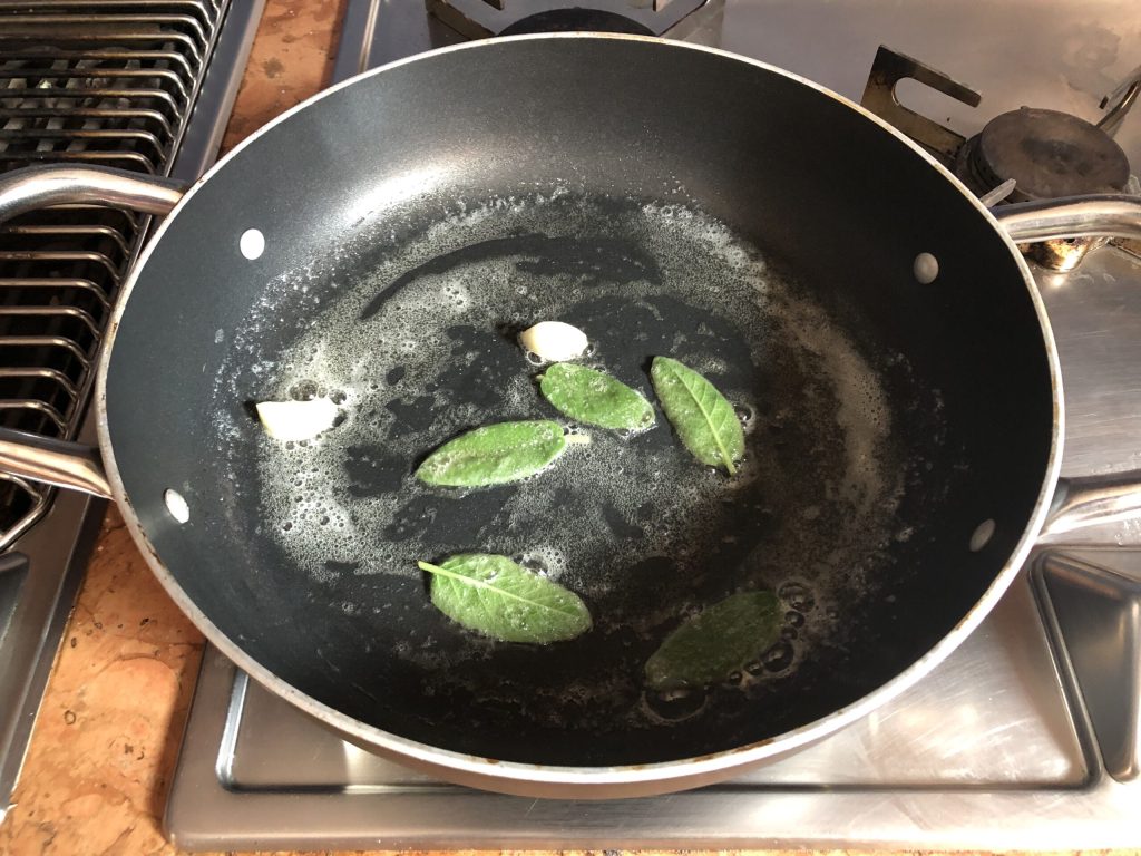 In a large pan, melt the butter with a peeled and halved garlic clove and a few sage leaves.