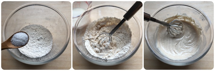 • Put the flour in a bowl with the salt. Then gradually add the milk and mix with a hand whisk.