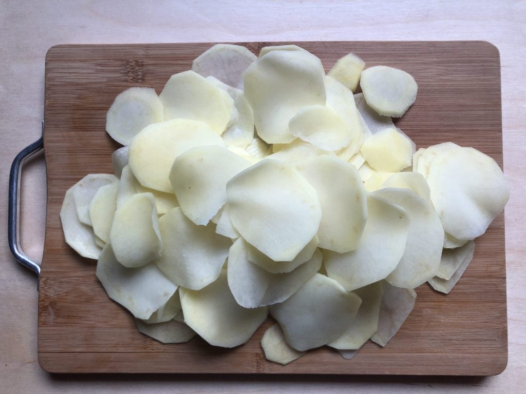 • Peel the potatoes, wash them, pat them dry with kitchen paper, and slice them thinly with a mandoline.