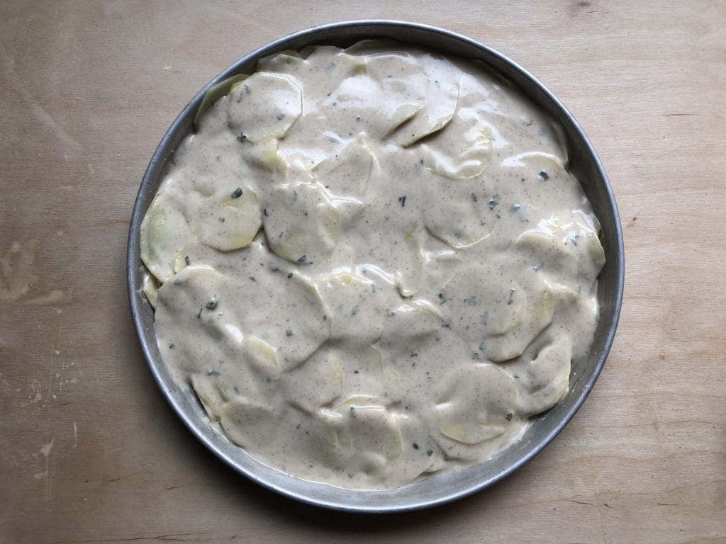 • Pour this batter over the potatoes, leveling it and trying to fill all the empty spaces.