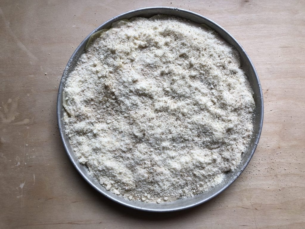 • Sprinkle the entire surface with the grated cheese and season generously with freshly ground black pepper.