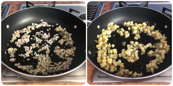 In a pan, heat a few tablespoons of oil before adding the shallot. Let it sizzle for a moment, then add the potato cubes and stir-fry them over high heat for 5 minutes, stirring very often.