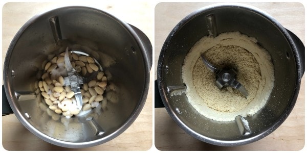 • Place the almonds in a food processor, add a tablespoon of sugar taken from the total, and grind them finely until you obtain a flour. I used a Thermomix, processing for 15 seconds at speed 7.