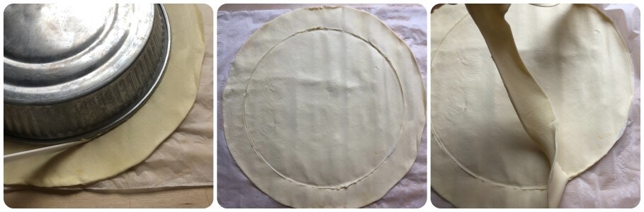 To cut the two puff pastry discs, I used two pans as guides, one with a diameter of 9.5 inches and one of 10.2 inches. You can also use just one (the smaller one) and cut the second puff pastry disc slightly larger than the pan.