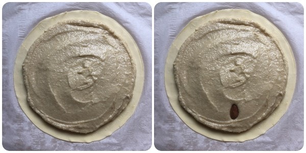 • Spread this cream in the center of the smaller puff pastry disc and spread it with the spatula, leaving a couple of centimeters of border free. Don’t forget to place the whole almond inside the cream. I used an unpeeled one.
