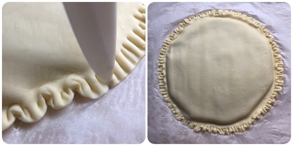 After this initial cooling period, with the tip of a knife, fold the puff pastry edge inward, creating a decorative pattern.