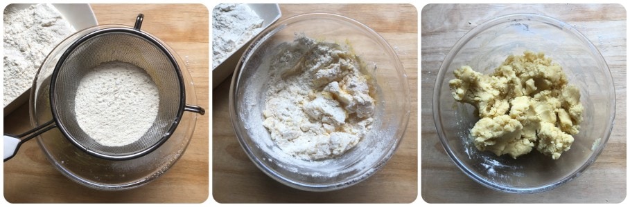 At this point, start adding the sifted flour together with the vanillin through a fine-mesh sieve and work the dough in the bowl. If it seems too crumbly, add a little egg white; I suggest proceeding one tablespoon at a time. This may depend on the quality of the flour.