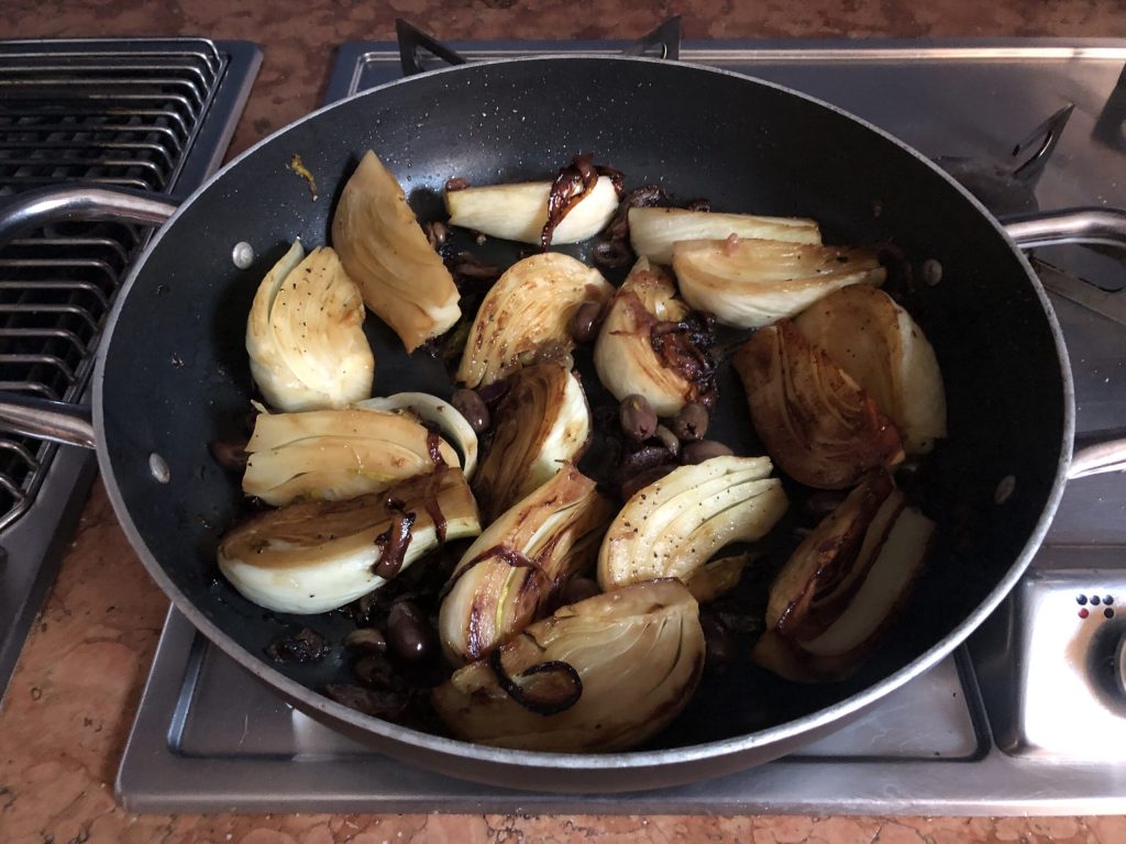 What I present to you today is golden fennel in a skillet with red onions and black olives. It’s a simple side dish but really full of flavor, perfect when you want to bring something wholesome to the table with a little extra touch. The slow searing in the pan (to be honest, I used a tegame but these are details đ) gives the fennel a golden surface and a soft heart, while the red onions soften and become fragrant and slightly caramelized. The result is a dish with a perfect balance of sweetness and savoriness. It’s the ideal recipe when you have few ingredients but want something tasty without turning on the oven or too much fuss. Serve it hot with its glossy, enveloping cooking juices. Paired with any kind of main (meat, fish, or cheeses) it always looks great. Prepare the pan and let the slow cooking do the rest.