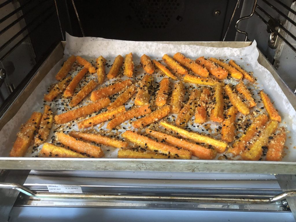 Today I’m showing you a way to make simple carrots extremely appetizing and appealing. I’m sure that even children will happily eat these oven-baked gratinated carrots. The black sesame seeds give the dish a touch that is very pleasing to the eye. However, if you can’t find them (although they are now available in almost all supermarkets) you can replace them with the more common white sesame seeds. I assure you that they will hardly make it to the table, especially if you have someone wandering around the kitchen when you take them out of the oven. That’s what happened in my house. Just enough time to take pictures and my son Lorenzo practically made them disappear, leaving only a few sad little pieces in the tray. Then he justified himself by saying these exact words: “you should be happy; it means they were really good.” Well… next time I will make more.