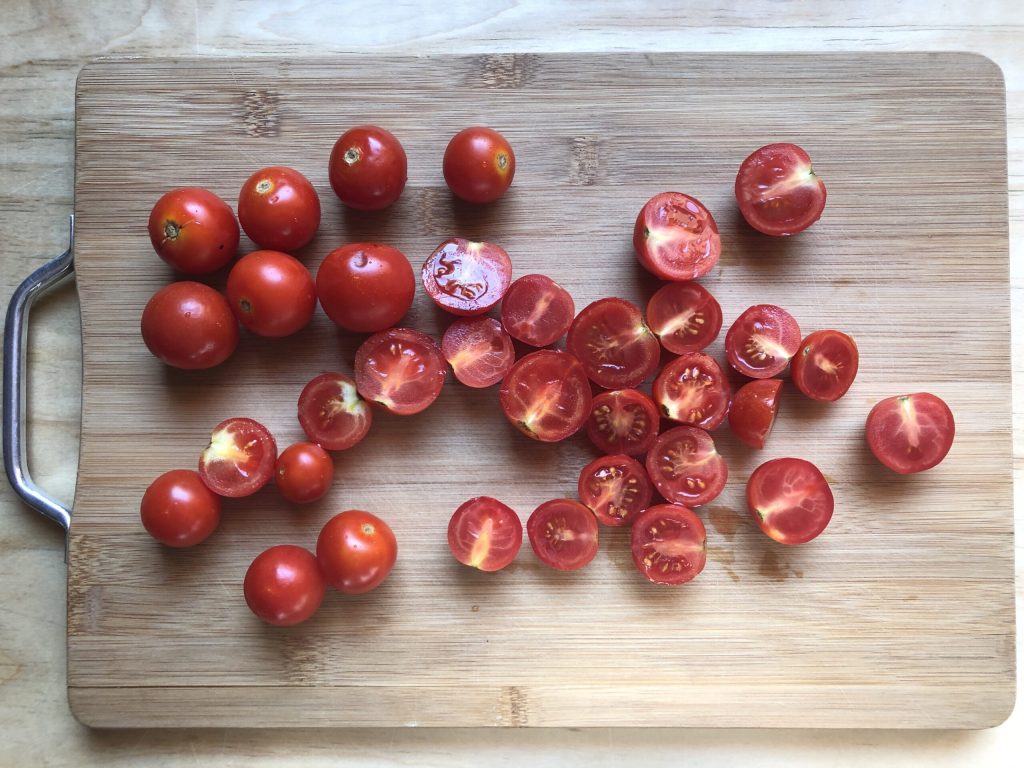 Wash the cherry tomatoes well, pat them dry with kitchen paper, and cut them in half.