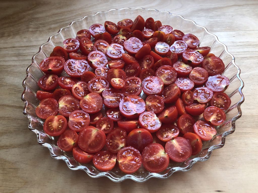 Distribute this mixture evenly over the cherry tomatoes and drizzle with a little oil.