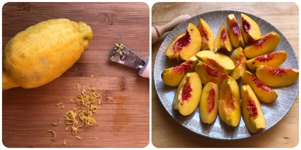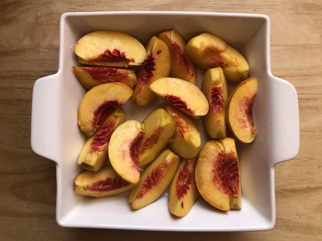 Wash the peaches, pat them dry with paper towels, cut them in half, and remove the pit. Then divide each half into 3 wedges.