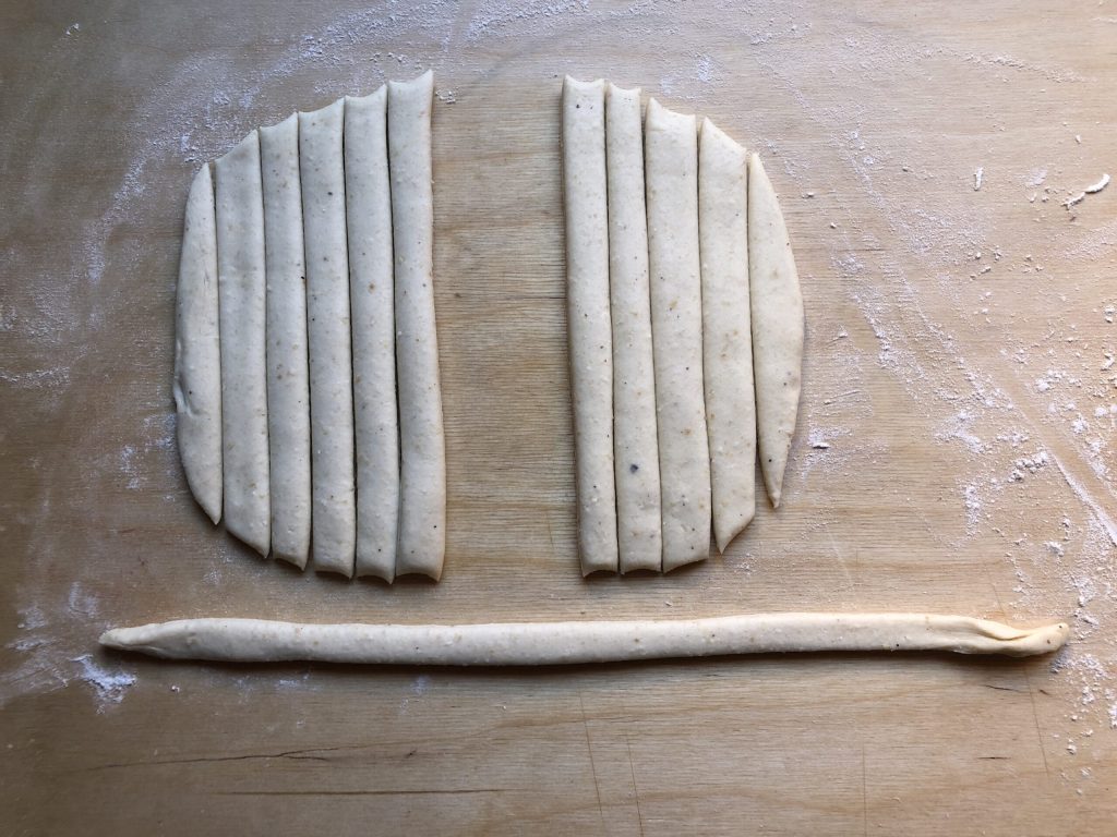 • At this point, using a pizza wheel or a long-bladed knife, cut the dough into strips about 1 cm high (about 3/8″).