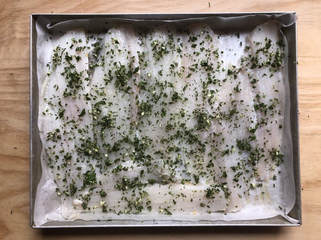 Line a baking tray with parchment paper and brush it with a little oil. Then place the sole fillets on it in a single layer. If, like me, you use frozen fillets, I recommend transferring them from the freezer to the refrigerator the night before.