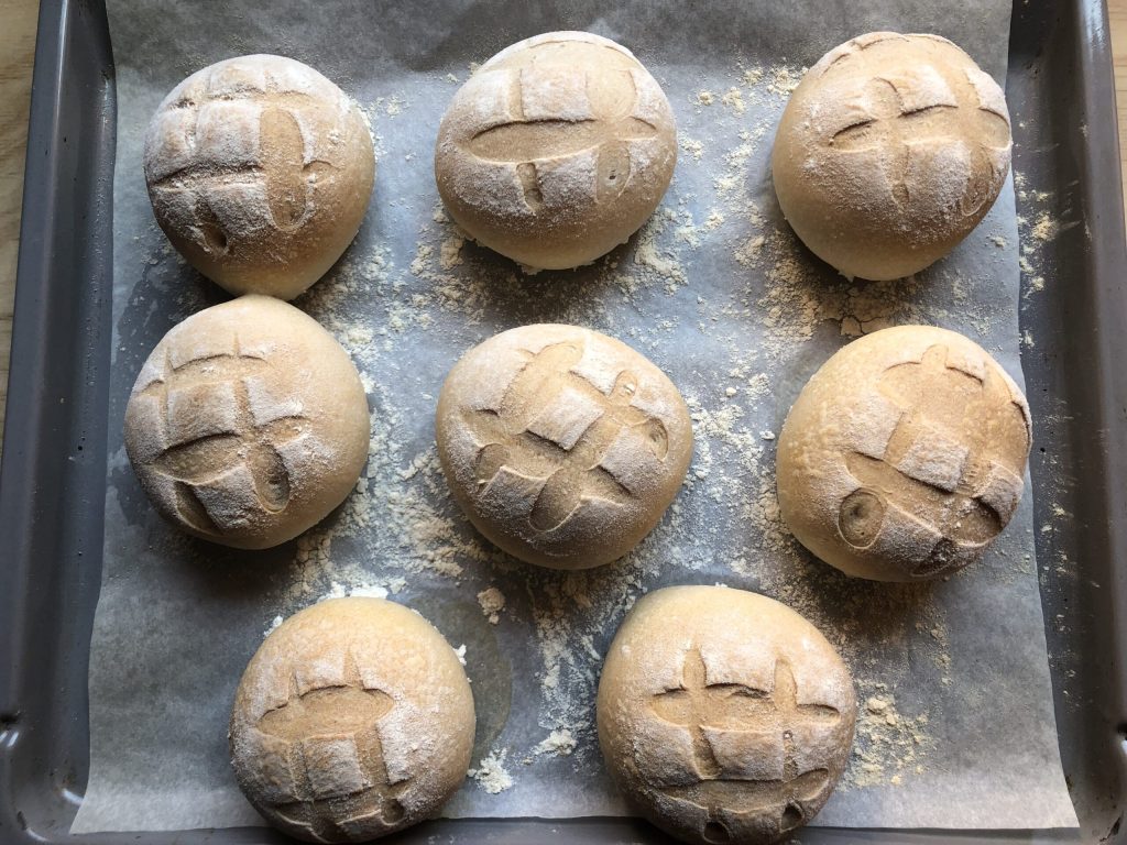 Now dust the surface of the rolls with flour and make two vertical and two horizontal cuts in each, as shown in the photo.